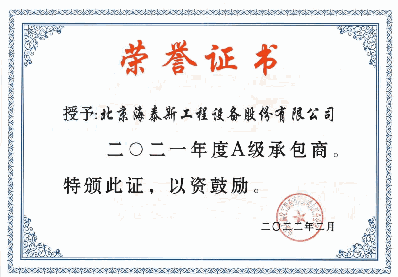 海泰斯獲評“A級承包商”榮譽稱號