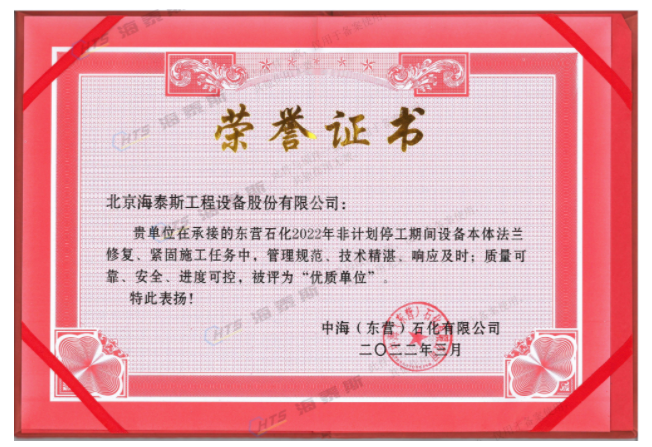 海泰斯獲評“優(yōu)質(zhì)單位”!負責(zé)的催化裝置、常減壓裝置泄漏法蘭的在線修復(fù)和定力矩緊固施工任務(wù),實現(xiàn)了“零泄漏”的目標(biāo)。